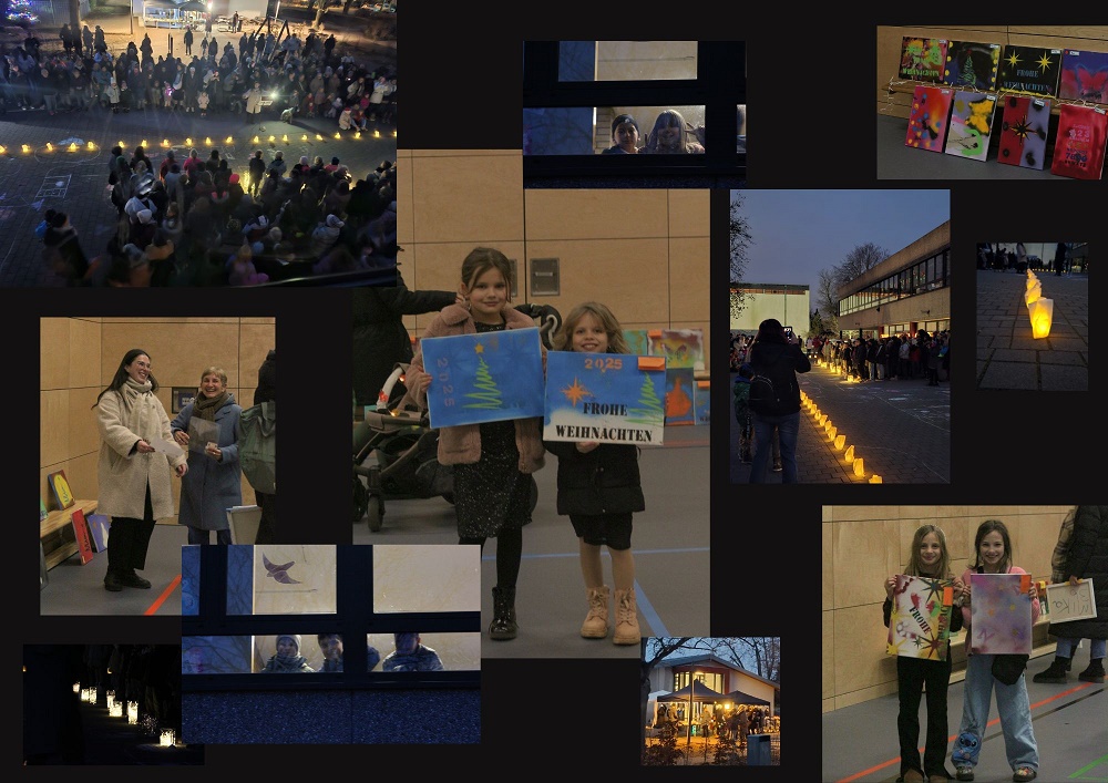 Zum Einstimmen auf die Weihnachtszeit, trafen sich die Kinder mit ihren Eltern und den Lehrern am Donnerstag vor dem ersten Advent in der Dämmerung auf dem Schulhof. Nachdem alle Klassen sich mit Lichterketten auf dem Schulhof eingefunden hatten, sang zuerst der Chor unter Leitung von Frau Lindemann drei Weihnachtslieder. Danach stimmten alle Kinder mit weiteren Weihnachtsliedern in die Weihnachtsstimmung ein. Anschließend trafen sich Kinder, Eltern, Lehrer, ehemalige Schüler und Schülerinnen bei warmen Getränken und Kuchen auf dem Schulhof. Der Förderverein freut sich über zahlreiche Spenden, die für Schuhaufsatzregale für die Kinder verwendet werden.